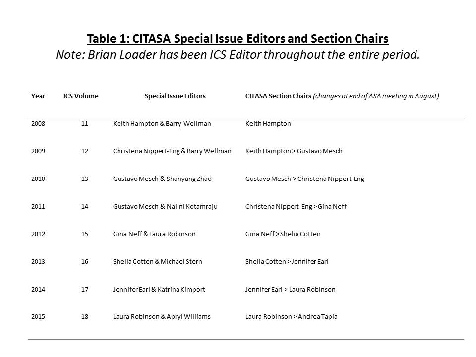 [1] CITASA” is the Communications and Information Technology section of the American Sociological Association, while “ICS” is the Information, Communication & Society” journal.